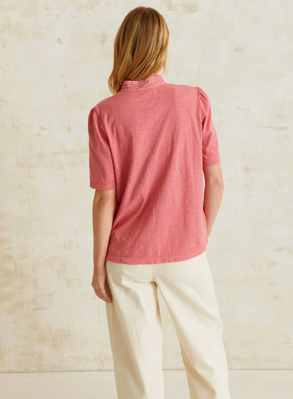Short-sleeve Mao-neck blouse. Pleats. Button close at the neck.