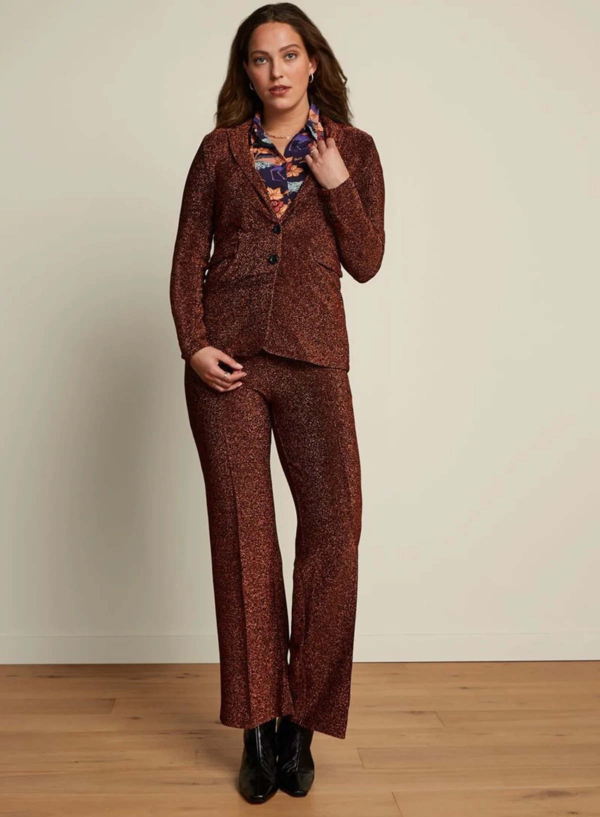 Glitter jersey long fitted blazer with a lapel collar and long sleeves, with buttons on the cuffs and a two button front closure, with flap pockets in a comfort stretch fabric. Matching trousers available.