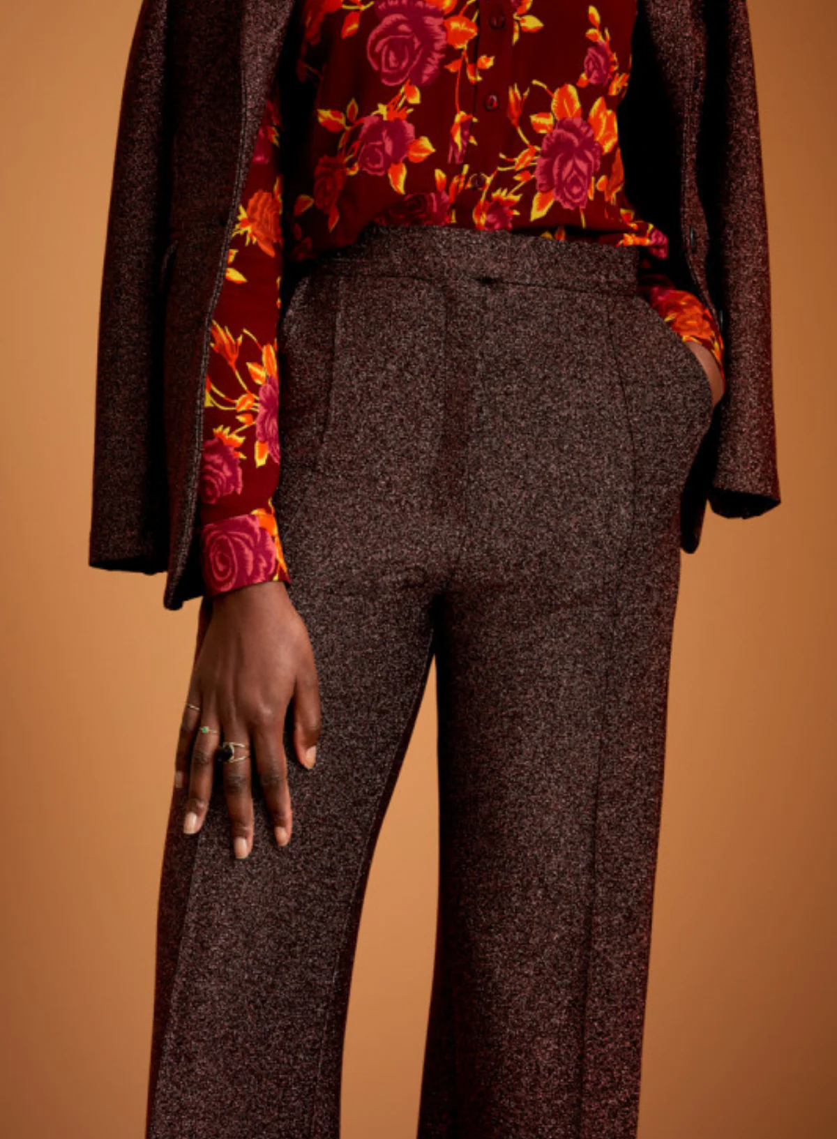These fabulous bronze brown glitter jersey trousers are exactly what your wardrobe needs with the upcoming sparkly season! There is also a matching jacket which makes a fabulous co-ord! With wide legs and in-seam pockets and a pocket at the back, a side-seam zipper in a stretch fabric.