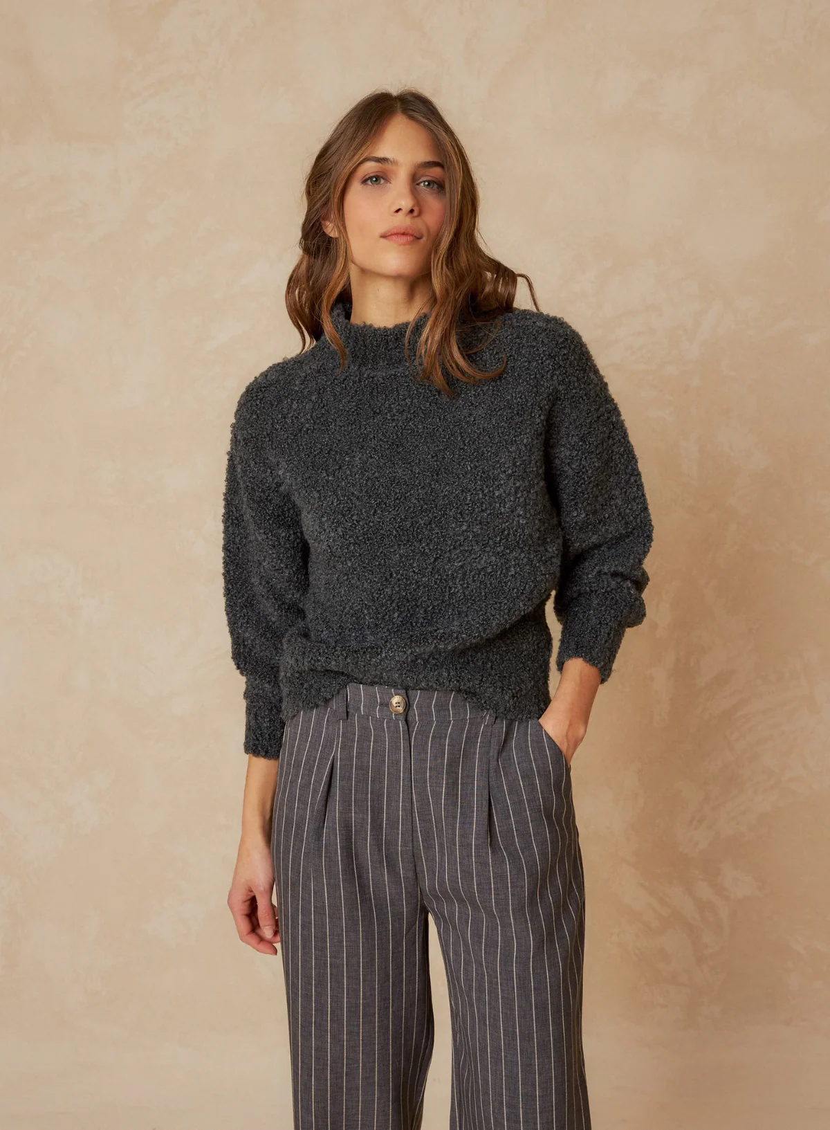 A basic sweater but with a unique twist thanks to the teddy knit fabric. It features a Perkins collar, dropped shoulders, and slightly balloon sleeves. The combination of the straight cut and the fabric makes it very comfortable. Made in Italy.