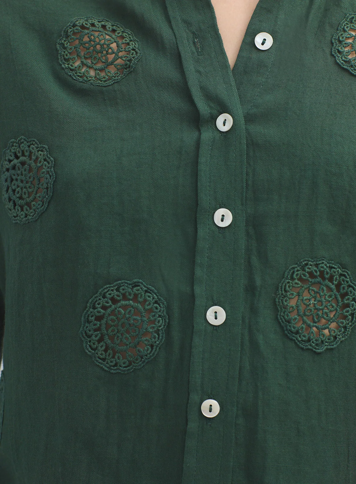 BCI cotton shirt. Round neck. Floral embroidered detailing on the front. Centre fastening with buttons. Long sleeves.
