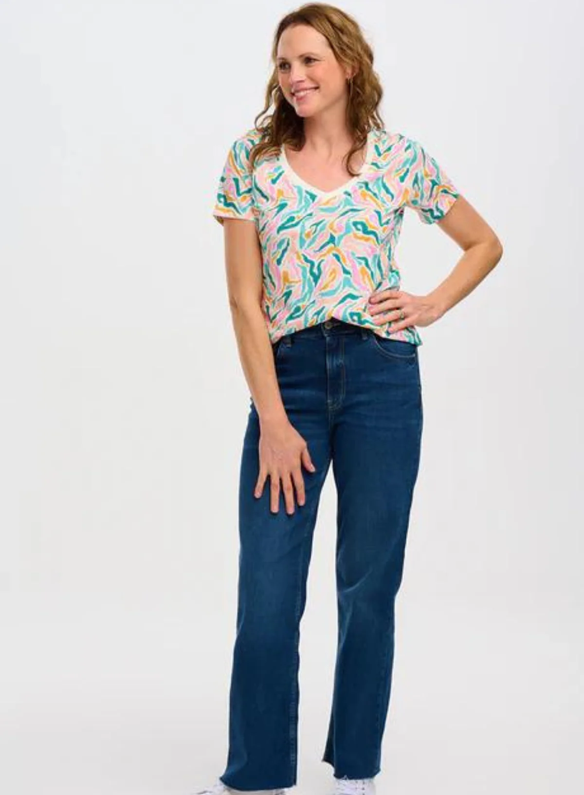 Sugarhill have updated their signature t-shirt shape, the NEW Khloe has straight side seams and a straight back but we've added a much-requested deep v-neckline. We love the soft pastel blue and pink animal print, but it's the soft 100% Organic Cotton base that makes this tee extra special.