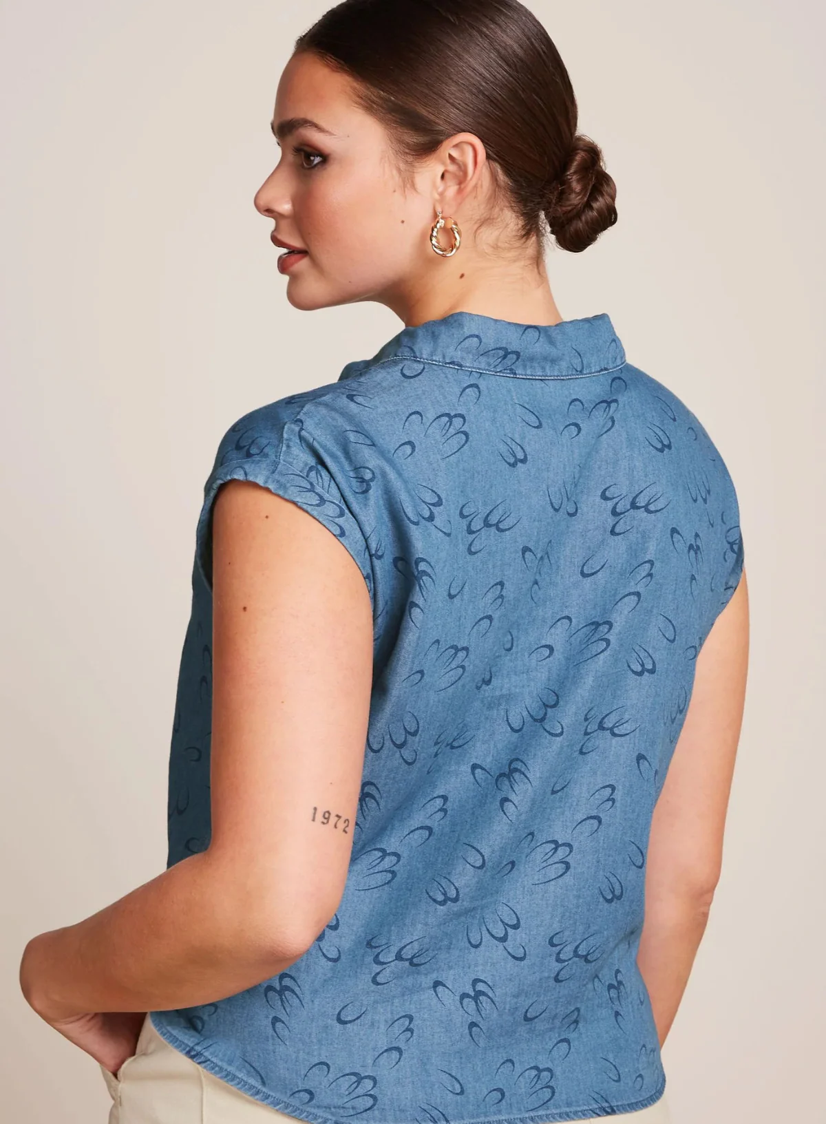 Blouse with knot detail and short sleeves, in a non-stretch fabric with a boat neck. Button front closure in a woven graphic print. Tencel™ Lyocellail.