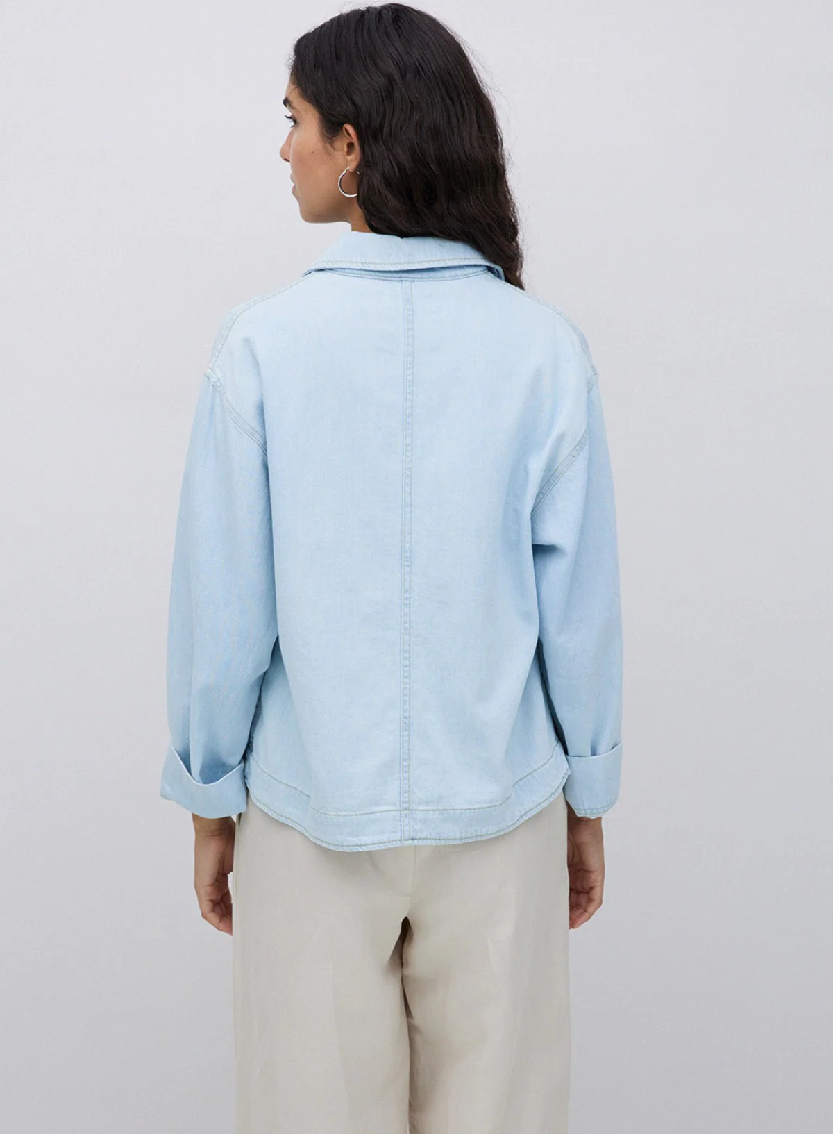 Denim jacket. 100% organic-cotton fabric. OEKO-TEX dye. Straight cut. Collar. Long sleeves. Metal button fastening. Rounded hem. Topstitching. Patch pockets with button on the chest.