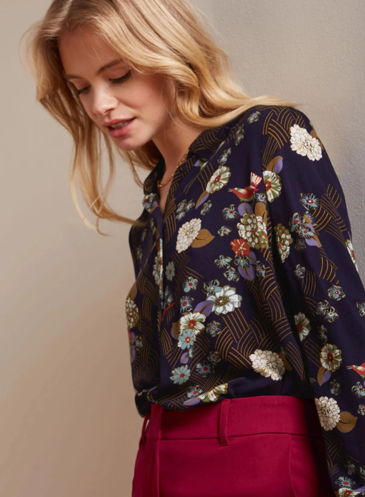 Loose blouse fit with long sleeves with cuffs and a blouse collar. Button front losure in a woven non stretch floral print.