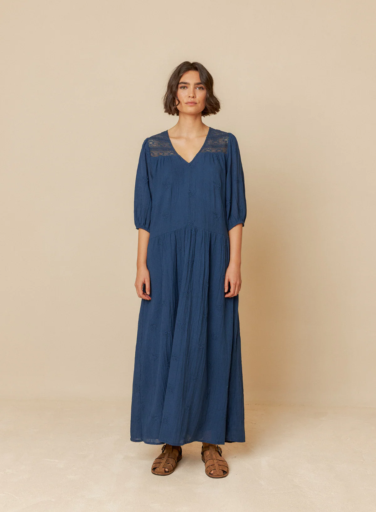 A super-soft dress with a low-waist cut and a relaxed fit. It features delicate machine embroidery and inset lace.