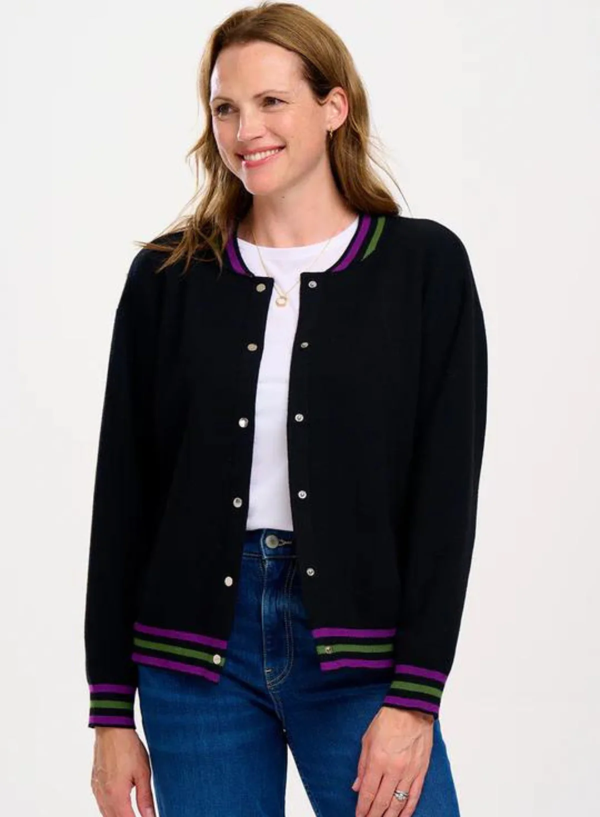 The Monay is a new style this season, featuring a relaxed fit with popper fastening and pockets. This knitted Bomber jacket is ideal for layering and looks great worn with jeans.