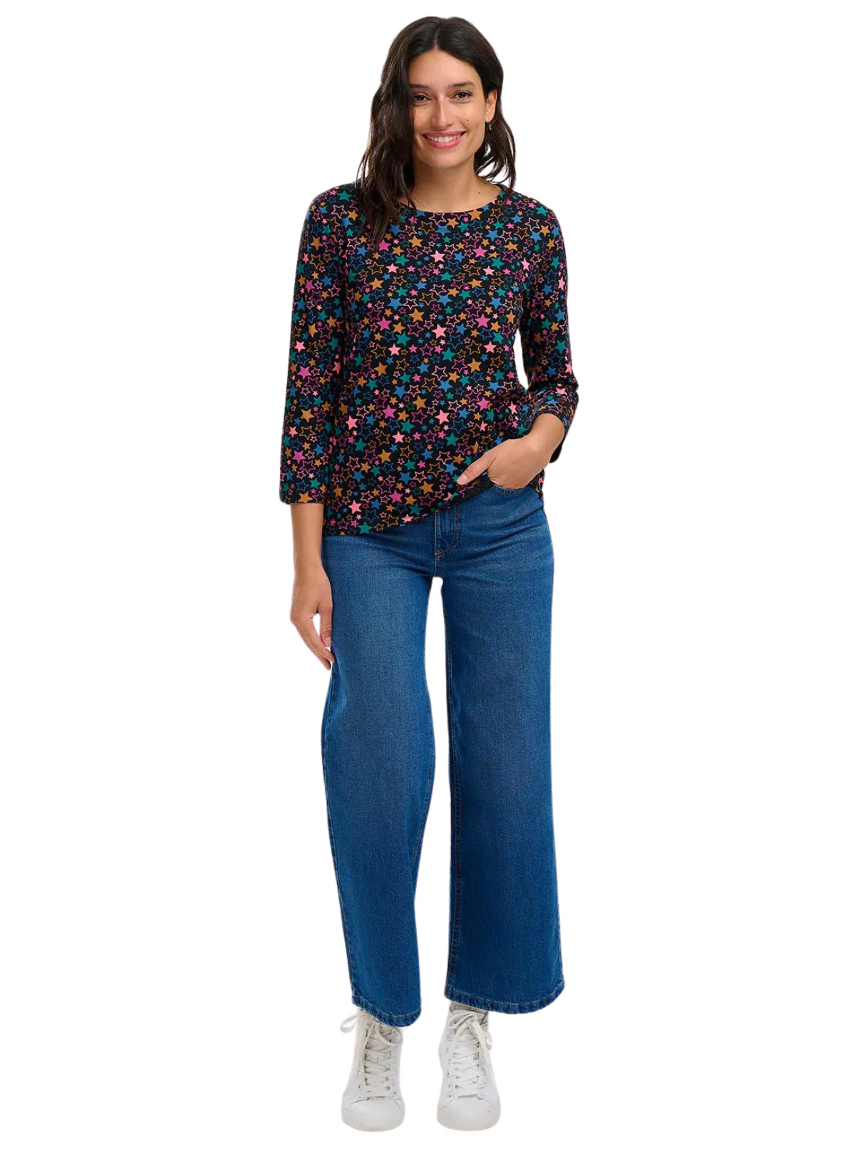 Made from a soft 100% organic cotton, the Noor Jersey Top combines our Breton style, with a boxier, relaxed shape. Featuring stars in pink, blue, teal and mustard printed on a classic black base.