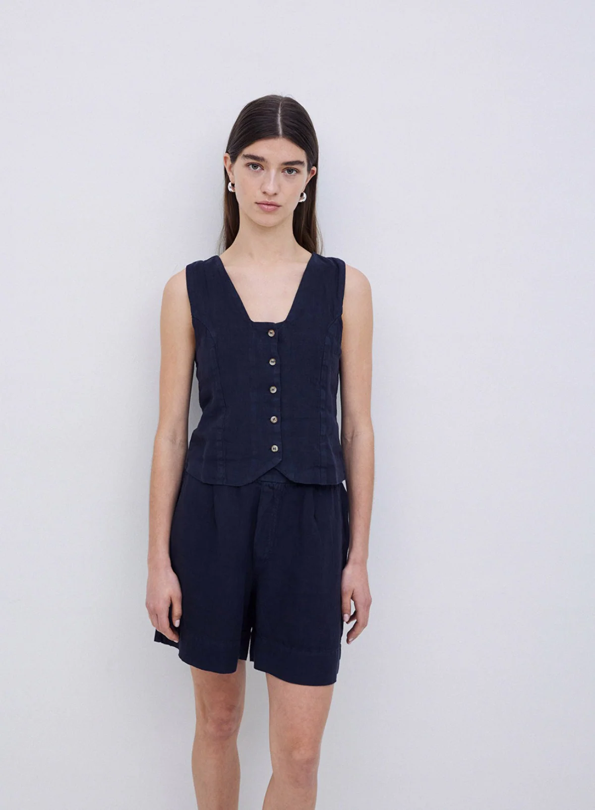 100% European Flax linen vest. OEKO-TEX dye. Straight cut. V-neck. Tortoiseshell-effect button fastening. Adjustable strap at the back.