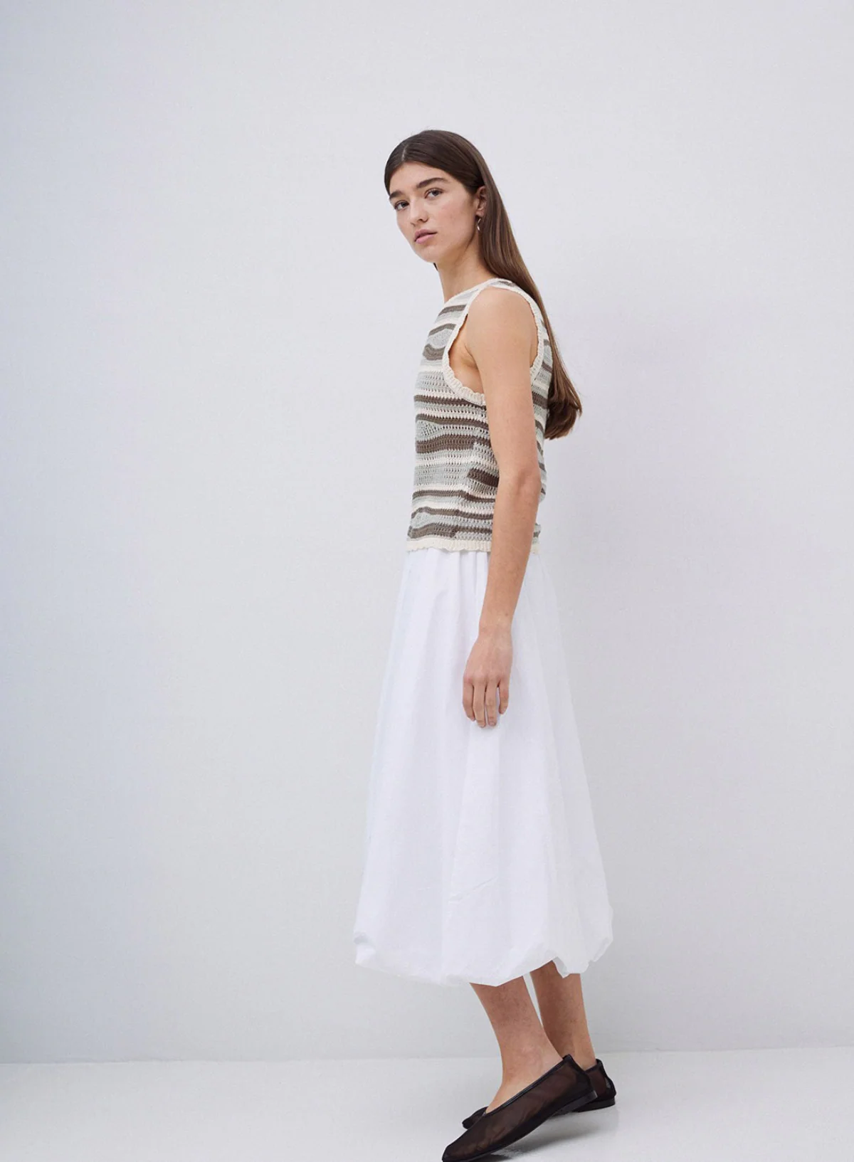 Sleeveless knit top. Cotton, linen and silk blend fabric. Straight cut. Round neckline.