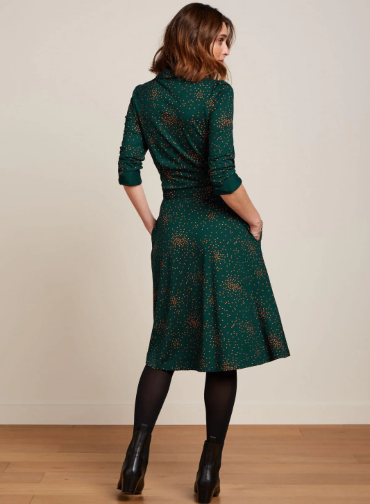 Shirt dress with long sleeves and a blouse collar. With a matching print tie belt, side pockets, in a jersey stretch polka dot print fabric.