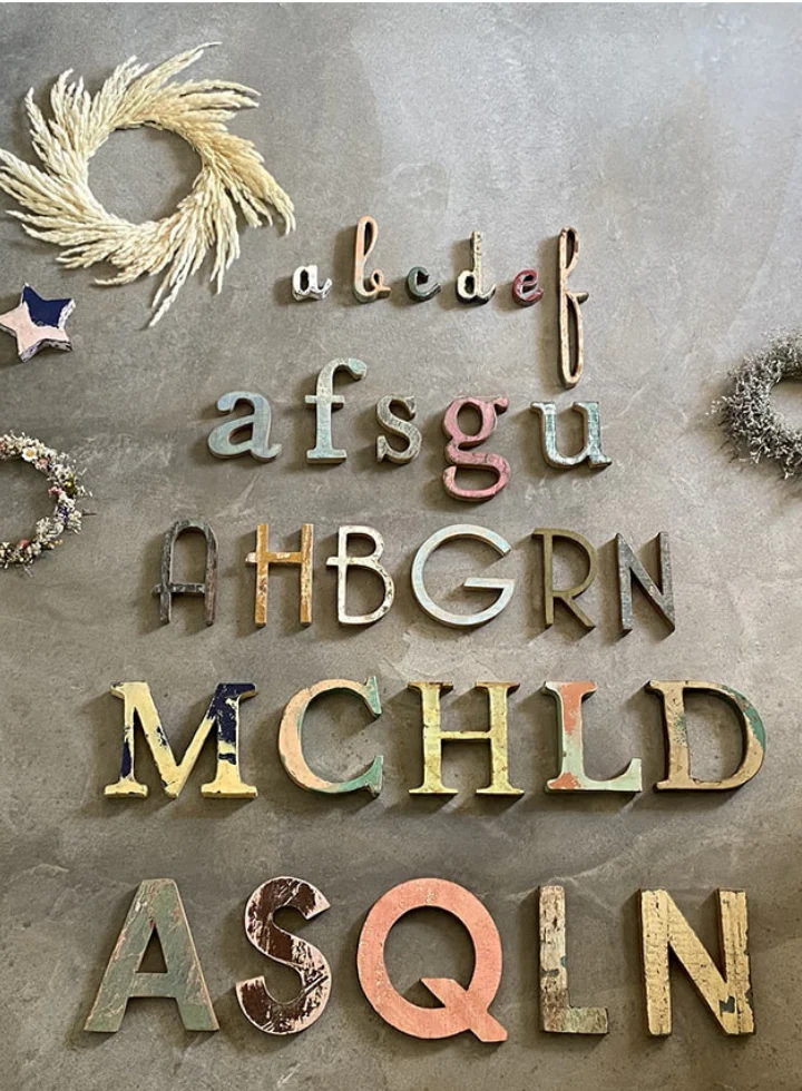 Chunky uppercase wooden letters beautifully crafted from reclaimed pieces of painted wood. Each letter has its own character and details making any combination unique to you.